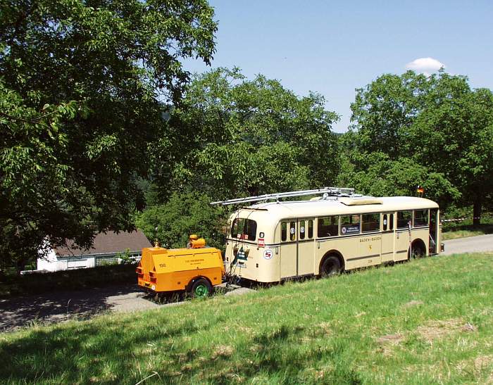 ihren Obus 224 per Tieflader nach Baden-Baden, wo er mittels Generatoranhänger