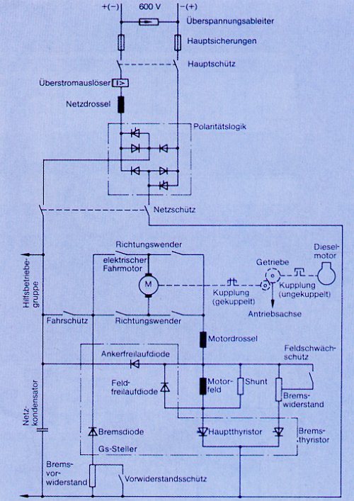 Bild 2 zeigt den Prinzip-Stromlaufplan der Traktionselektrik. Der Eingangskreis besteht aus Sicherungs- und Entstörbauelementen und aus dem Gleichrichter, der den Fahrbetrieb unabhängig von der Polarität der Fahrleitungsspannung ermöglicht. Die antiparallel geschalteten Thyristoren führen beim Bremsen den Rückspeisestrom ins Fahrleitungsnetz (nicht möglich bei verpolter Eingangsspannung). Die gleichgerichtete Eingangsspannung gelangt über Netz- und Vorladeschütz zum Netzkondensator, der mit der Netzdrossel einen Tiefpass bildet, und zur Hilfsbetriebegruppe, die von einem 11 kW-Gleichstromnebenschlussmotor angetrieben wird. Über das Fahrschütz erhält die Traktionssteuerung im Fahrbetrieb die Eingangsspannung. Als Leistungsstellglieder werden für die Freilaufkreise Siliziumdioden und für die gepulsten Strompfade Thyristoren verwendet. Die aufwendigen Löschkreise, sowie die Schutzbeschaltungen und die Ansteuerschaltungen sind im Prinzipschaltbild nicht dargestellt. Als Löschthyristoren werden zwei abschaltbare Gate-turn-off-Thyristoren (GTO) verwendet. Die Taktfrequenz beträgt 500 Hz (bei Anfahrstrom 120 Hz). Zur Stromglättung ist für den Fahr- und den Bremsbetrieb eine zusätzliche Motordrossel erforderlich. Für die Rückwärtsfahrt wird der Ankerstrom mittels Richtungswenderschützen umgepolt. Die folgenden zwei Prinzipschaltbilder verdeutlichen den Stromfluss der Fahr-/Bremsschaltung in der jeweiligen Betriebsart (die Ansichten werden durch Anklicken vergrößert dargestellt):