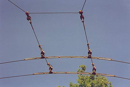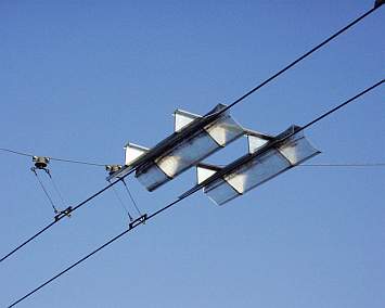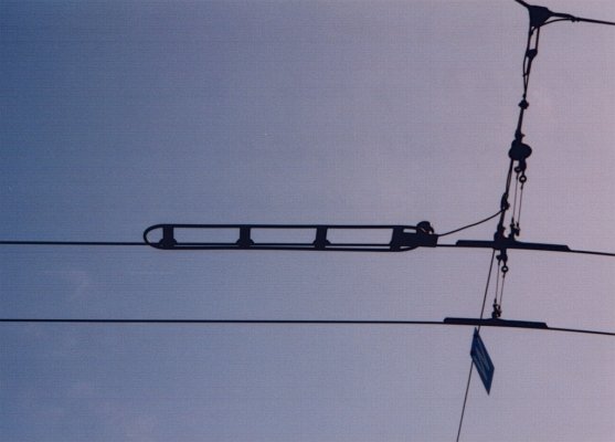 Einlaufweichen: Die folgende Abbildung zeigt eine Kummler & Matter U99 10°-Einlaufweiche mit mechanisch beweglichen Kreuzungsstück (Doppelzunge) für höhere Fahrgeschwindigkeiten. Der Stromabnehmerschleifschuh wird dabei durchgehend über den Kohleneinsatz geführt. Die Seitenwangen des Schleifschuhs steuern die beweglichen Zungen und stellen somit automatischen den richtigen Fahrweg her. Es ist die einzige Einlaufweiche dieser Bauart in Esslingen. Alle anderen Einlaufweichen sind mit starren Kreuzungsstücken ausgestattet.