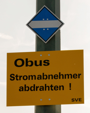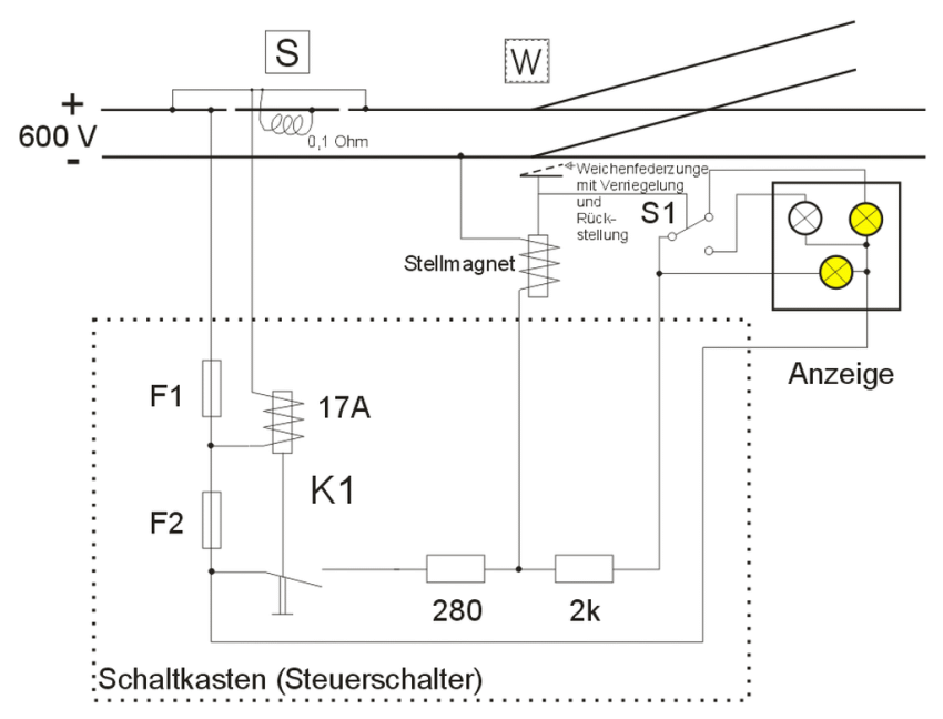 Früher wurden die Weichen entweder per Druckknopf an Schaltkästen, oder per Stellkontakt (fahrstromabhängig) bedient. Um diese Weichen sicher zu stellen, jedoch nicht zu sehr an Geschwindigkeit zuzunehmen, wurde früher oft gleichzeitig mittels Feststellbremse gebremst und "Strom gegeben". Um bei eingeschalteter Heizung und Kompressor ein unbeabsichtigtes Stellen der Weiche zu verhindern, musste ein Taster bzw. ein Lenksäulenhebel betätigt werden, um diese Verbraucher abzuschalten. Funktionsweise dieses Weichentyps: Prinzipschaltung einer Siemens-Weiche mit Stellkontakt Der Stellkontakt (S) ist innerhalb des Plus-Fahrdrahtes isoliert eingefügt, erhält jedoch dessen Potenzial abgesichert über F1 und die niederohmige Schützspule von K1 als auch über die Widerstandswendel am Stellkontakt. Passiert der Obus stromlos den Stellkontakt, wird das Gleichstromschütz K1 nicht erregt. Die Stellmagnete in der Weiche (W) erhalten keinen Stromstoß. Fährt der Obus mit eingeschalteten Verbrauchern (Heizung, Kompressor oder Fahrmotor), so fließt ein Teil des Stromes vom Plus-Fahrdraht über die Schützspule von K1 und über den Stellkontakt zu den Verbrauchern im Obus und zurück zum Minus-Fahrdraht. Überschreitet dieser Strom den Ansprechwert von 17 A (entspricht 10,2 kW), zieht das Schütz an. Dabei fallen über der Schützspule nur ca. 2 V ab. Über einen Druckknopf im Weichenschaltkasten ist das Schütz auch manuell schaltbar. Schaltet K1, so erhalten die Stellmagnete (im Schaltplan nur 1x dargestellt) über einen Vorwiderstand Spannung. Zum Bewegen der Weichenzungen reicht ein Stromstoß. Die Zungen werden in Abbiegestellung mechanisch verriegelt. Gleichzeitig schalten die Stellmagnete einen Umschaltkontakt, der die Richtungsanzeige umschaltet. Die Lampen erhalten ihr positives Potenzial ebenfalls abgesichert vom Weichenschaltkasten, das negative Potenzial über einen Vorwiderstand von 2 kOhm und über die Spulen der Stellmagnete. Die Rückstellung erfolgte bei diesem Weichentyp mechanisch nach Befahren der Weichenzungen in Abbiegerichtung (Rückzug der entriegelten Weichenzungen über Federn). Bei den in den 80er-Jahren erneuerten Stellkontaktweichen wurde der Stellkontakt im Minus-Fahrdraht (rechts in Fahrtrichtung) eingebaut. Die Rückstellung geschah elektrisch, ausgelöst durch einen induktiven Geber.