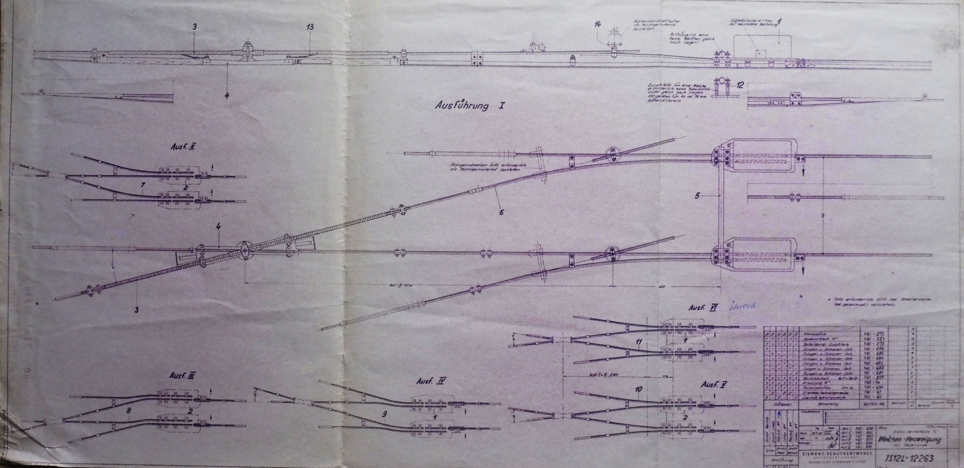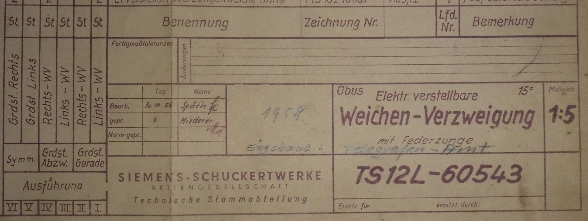 Verschiedene Weichen-Verzweigungen aus einer Zeichnung der Siemens-Schuckert-Werke vom 10.07.1959 1961 wurde in der Schorndorfer Str. eine SSW-Weiche der Ausführung VI für die Verlängerung nach Lerchenäcker installiert