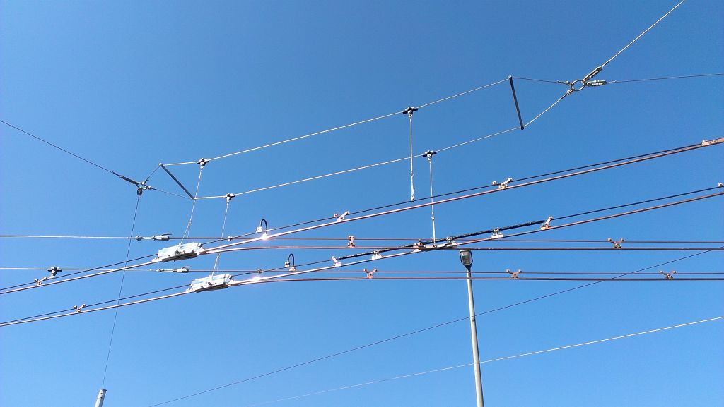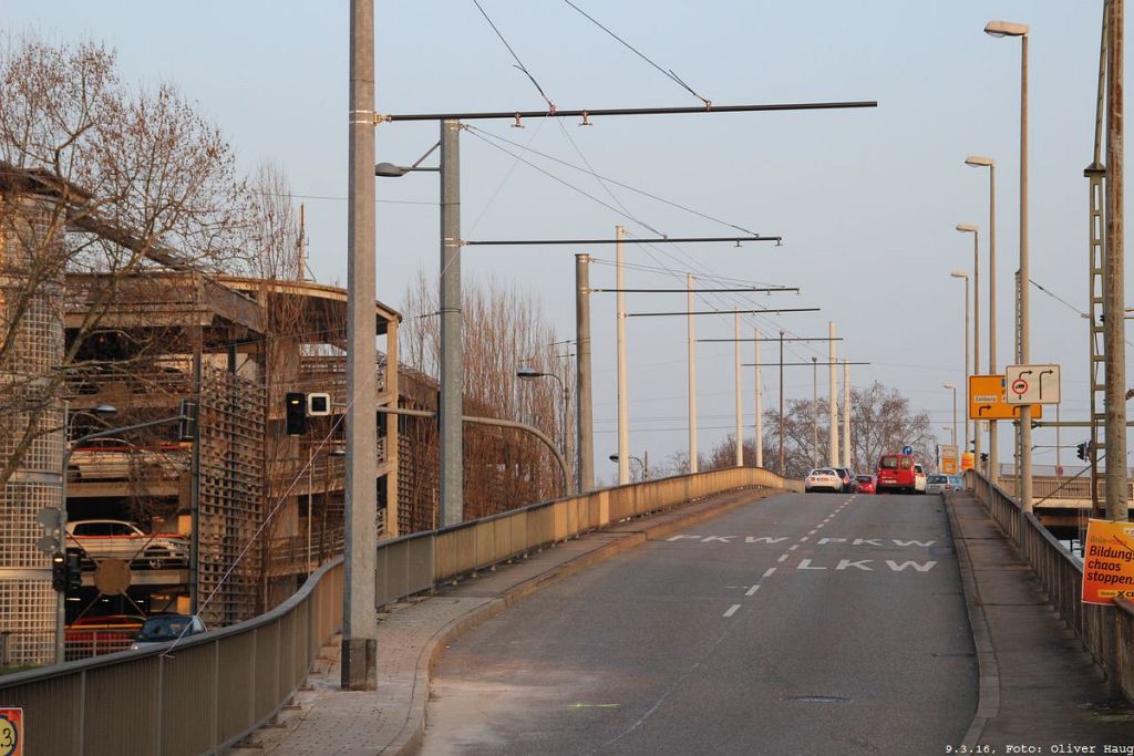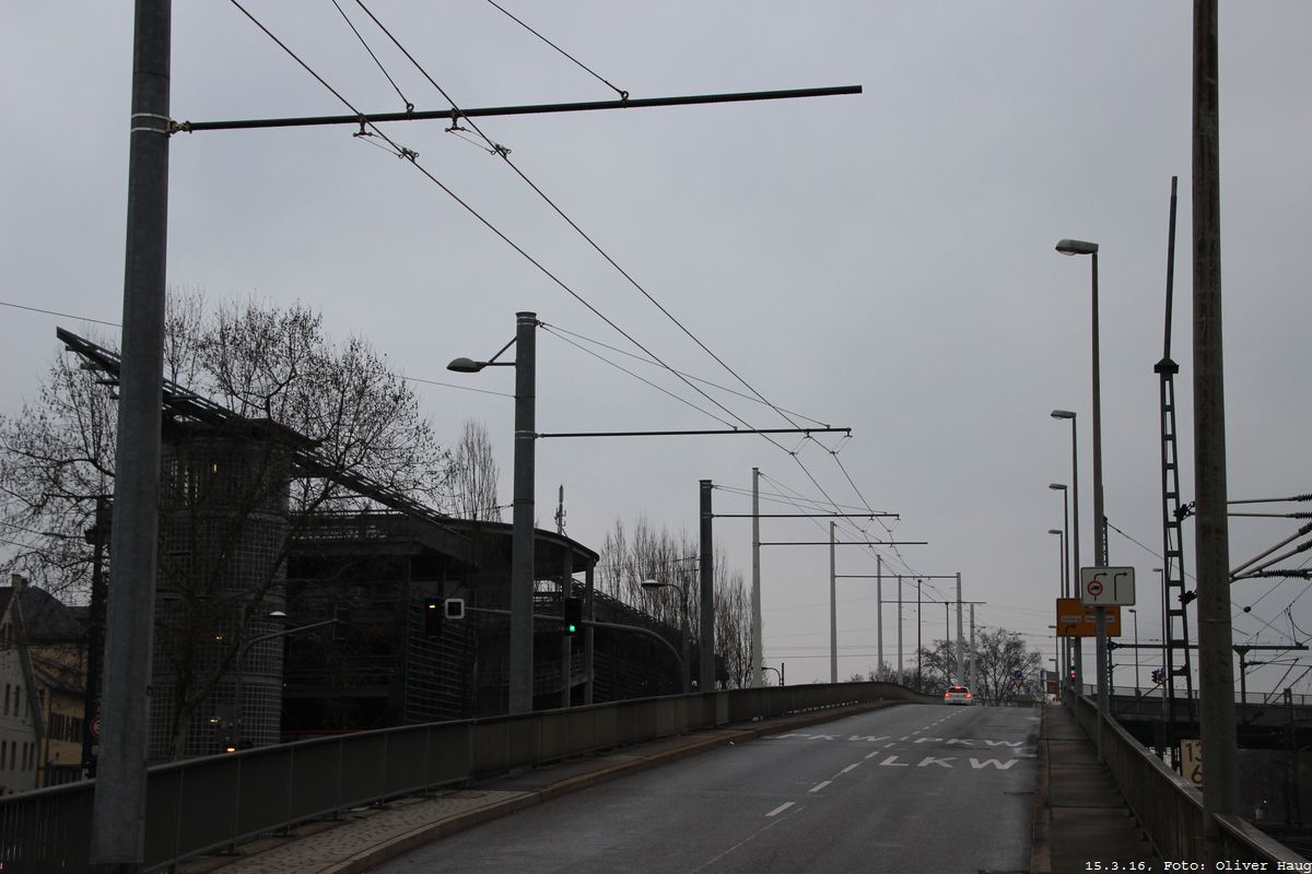 Fahrleitung entlang der Rampe zur Vogelsangbrücke. Dieser einspurige,