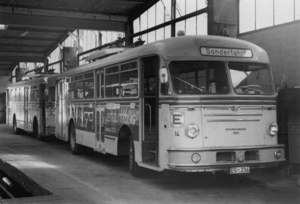 Obus 14 ist am 30.09.1972 mit gespreizten Stromabnehmerstangen in der Depothalle abgestellt