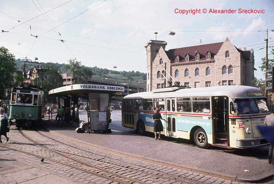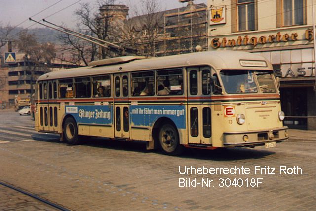 Obus 13 am 20.03.1972 am Esslinger Bahnhofplatz Mit freundlicher Genehmigung von Fritz Roth (†), Maintal. Bezug unter www.nahverkehrs-bildarchiv.de möglich.