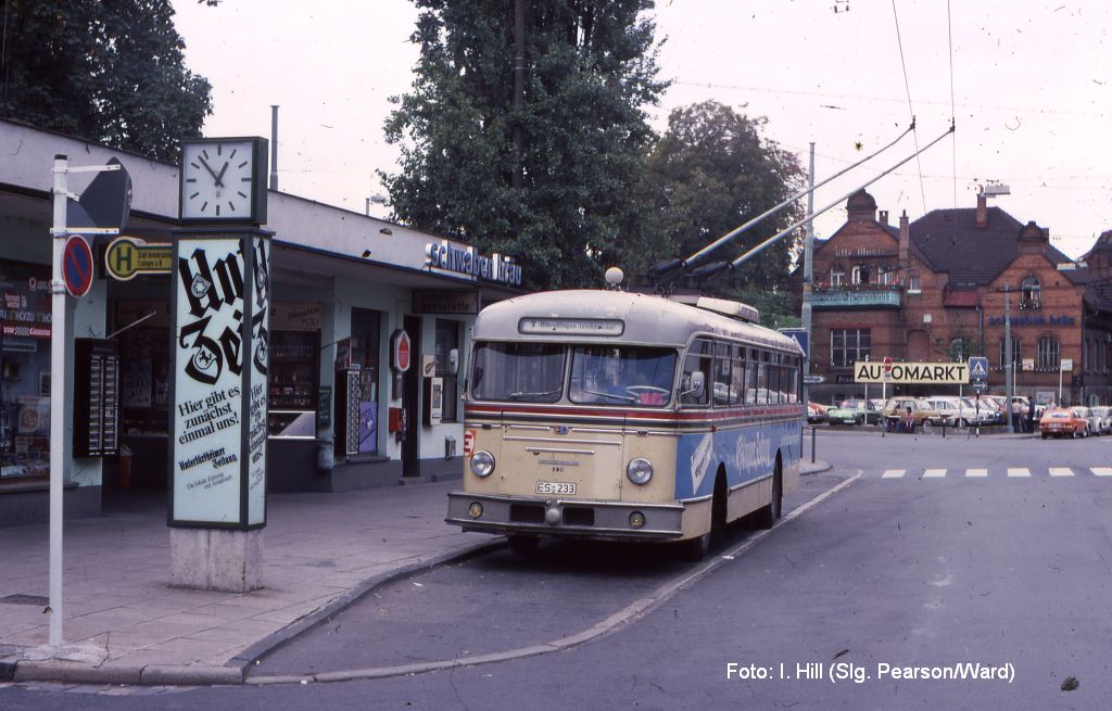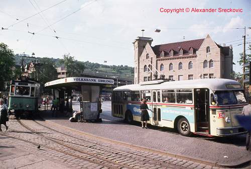 Die Erinnerung an diese Wagen verblasst nicht. Durch ihren selten gewordenen Einsatz Ende der 70er-Jahre galten sie schon damals als Besonderheiten und als die "Methusalems" der Esslinger Obusflotte. Gelegentlich wurden zu meiner Freude beide ÜHIIIs in der Nachmittagsspitze eingesetzt. Obus 13 mit der himmelblauen Reklame sah man etwas häufiger auf Linie als Obus 14 mit der dunkelblauen Reklame, der nach meiner Erinnerung öfter mal ein Problemchen hatte. Ich erinnere mich auch an eine außerplanmäßige Fahrschulfahrt auf Linie mit Obus 14. Der Fahrlehrer, noch mit Uniform und Mütze bekleidet, drehte seinen Schemel neben dem Fahrer in eine dafür vorgesehene Aufnahme im Fußboden und gab dem Fahrer Anweisungen. Vermutlich gab es nur noch in Esslingen und vielleicht auch noch in Kaiserslautern zu dieser Zeit Schulungen auf ÜHIIIs. Selten wurde das Druckluft-Notbremsventil rechts vom Fahrersitz als Haltestellenbremse benutzt. Beim Öffnen entwich die Druckluft für mehrere Sekunden mit einem Höllenlärm. Als Fahrgast saß man auf dem ehemaligen Schaffnersitz hinten rechts über allen Mitfahrern thronend. Aber meist saß man sowieso vorne, um dem Fahrer zuzuschauen, wie er den geräuschvollen 2-Hub-Fahrschalter bediente. Das war im Gegensatz zu den einfacher bedienbaren Fahrschaltern der HS160OSL äußerst interessant. Und dann war da noch der Hauptschalter mit Überstromauslöser, dessen Betätigung direkt über dem Kopf des Fahrers angebracht war. Manch groß gewachsener Chauffeur konnte durch die federnde Bewegung des Sitzes nicht aufrecht sitzen, ohne sich den Kopf am Hebel anzuschlagen. Selbst durch den Geruch im Innenraum unterschieden sich diese Wagen von allen anderen damaligen Obussen... Der 13er bekam 1977 eine Generalüberholung mit neuem Anstrich, so dass er fortan ein besseres und glänzenderes Erscheinungsbild als Obus 14 hatte. Ich erinnere mich an einen Nachmittag, an dem der Obus 13 nach dem Waschen zum Trocknen in dem kleinen Hof an der hinteren Hallenausfahrt stand. Dieser war öffentlich zugänglich, da dort die Eingänge der angrenzenden Häuser waren. An den Stangen haftete kein bisschen Schmutz, sie waren lackiert, ohne Bandagen. Der Obus hätte damals schon als Museumswagen gelten können, so bildschön stand er da. Zweifelsohne war er das schönste Fahrzeug der Flotte. Leider interessierte sich die damalige Werkleitung nicht für den Erhalt eines historischen Oberleitungsbusses. Erwähnenswert ist auch die Tatsache, dass diese beiden Obusse sogar sämtliche 1971 gebraucht übernommene, jüngere Fahrzeuge überdauerten. Die folgenden ersten beiden Bilder wurden von Alexander Sreckovic am 22.06.1977 aufgenommen (zur vergrößerten Ansicht auf Bild klicken).