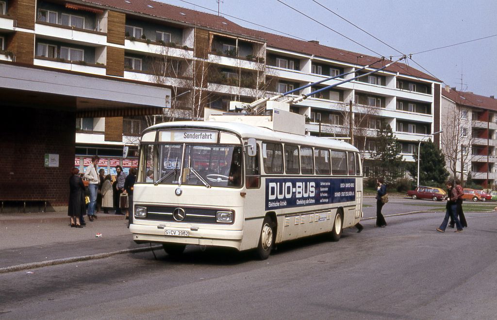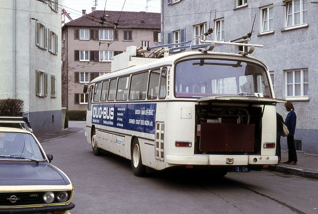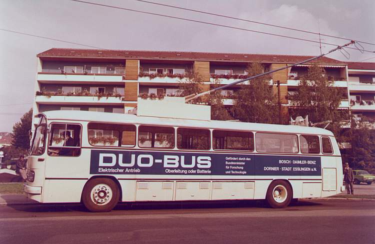 Dieser 1969 von Mercedes-Benz als Hybrid-Erprobungsfahrzeug gebaute O 302 wurde im Jahre 1974 zum ersten DUO-Bus Deutschlands umgebaut. Der damalige Bundesforschungsminister und Esslinger Abgeordnete Dr. Volker Hauff forcierte die Entwicklung des DUO-Busses und schlug Esslingen für einen späteren Referenzbetrieb vor. Die Gründe für die Entwicklung des DUO-Antriebs lagen auf der Hand: Gezeichnet durch die Erdölkrise 1973 war man in Esslingen froh, ein elektrisch betriebenes Fahrzeug zu haben, hatten doch die meisten anderen deutschen Städte dieses Verkehrsmittel längst aufgegeben. Andererseits war man in der prekären Lage, überalterte Betriebsmittel zu besitzen, die in den nächsten Jahren dringend der Erneuerung bedurften. Der DUO-Bus stellte die Möglichkeit in Aussicht, den umweltfreundlichen elektrischen Betrieb auszudehnen, ohne teure Investitionen für die Streckenelektrifizierung ausgeben zu müssen. Für dieses Konzept interessierte sich auch die Industrie, nachdem seit etwa zehn Jahren zuvor in der BRD praktisch keine Obusse mehr gebaut wurden. Für Esslingen bedeutete die Aufnahme des DUO-Bus-Betriebes den Erhalt des Obus-Systems. Ich bin überzeugt davon, dass es ohne die Aussicht auf den DUO-Bus Anfang der Siebziger Jahre heute keinen Obus-Verkehr in Esslingen mehr gäbe. Mit Bundesmitteln gefördert, war man in den kommenden Jahren in der Lage, wenigstens teilweise den Fuhrpark zu erneuern. So stand also zur Durchführung des DUO-Bus-Versuchsbetriebes ein Erprobungsfahrzeug zur Verfügung, welches neben dem konventionellen oberleitungsgebundenen Betrieb auch fahrleitungsfreie Strecken mittels Traktionsbatterien befahren konnte. Beim DUO-Bus handelte es sich um eine Entwicklung der Arbeitsgemeinschaft Robert Bosch GmbH (Antriebstechnik), Mercedes-Benz AG (Fahrzeugtechnik), und Dornier System GmbH (Stromabnehmer und Systemführung).